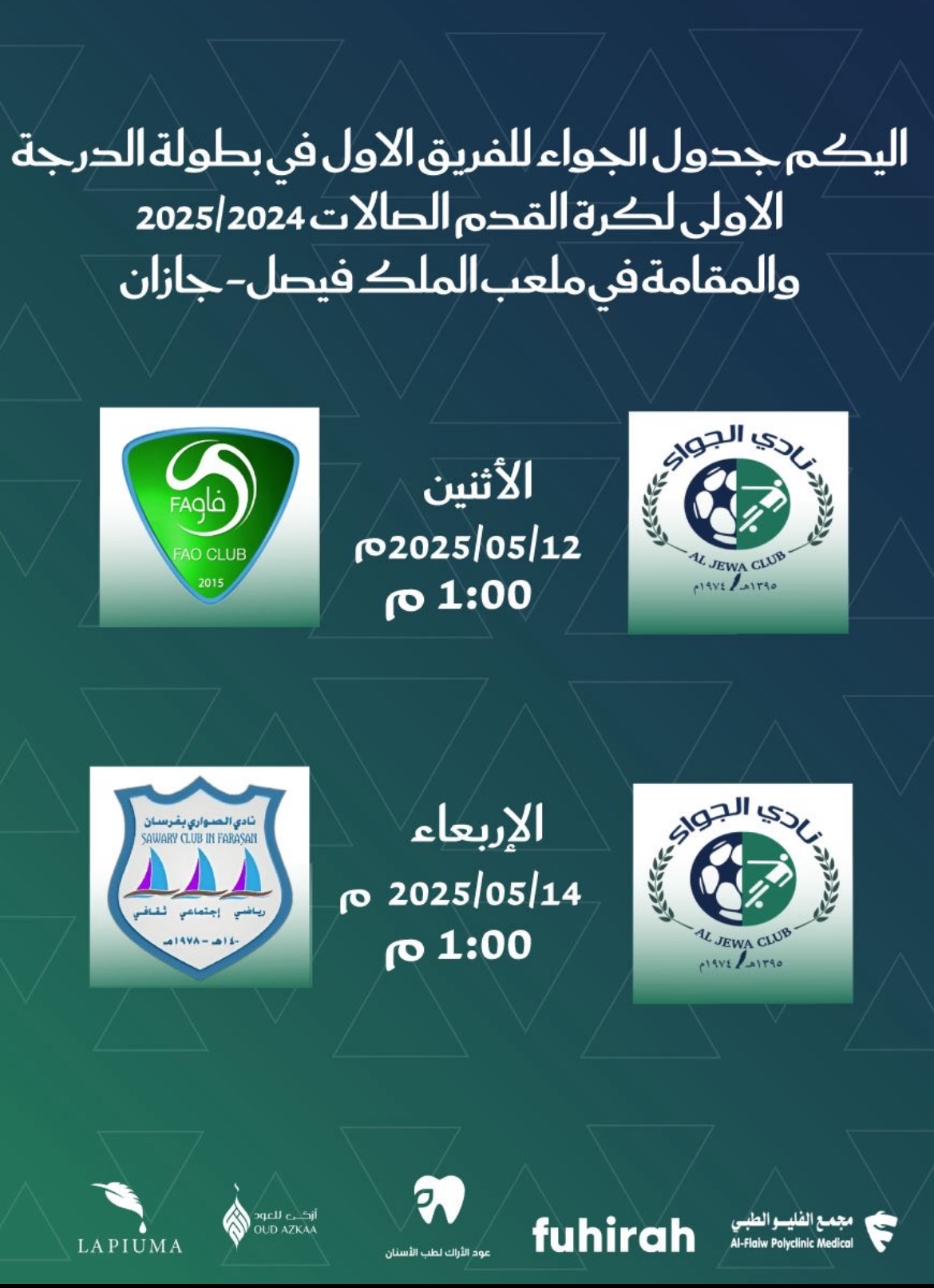 يستهل #الجواء مشواره ظهر اليوم في بطولة الدرجة الأولى لكرة القدم للصالات والمقامة في جازان